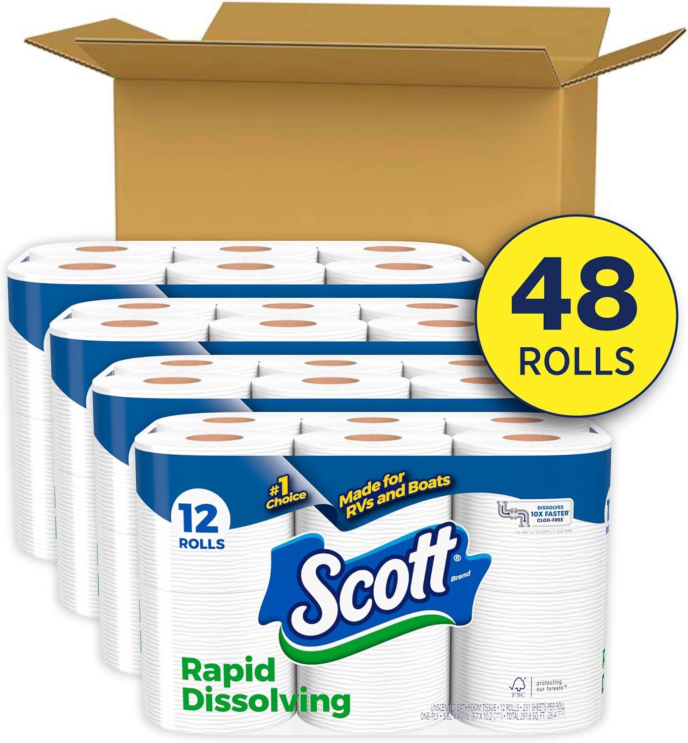 48 Double Rolls of Scott Rapid-Dissolving Toilet Paper, 1-ply, 231 sheets per roll; toilet paper that's easy on your wallet, easy on your pipes
